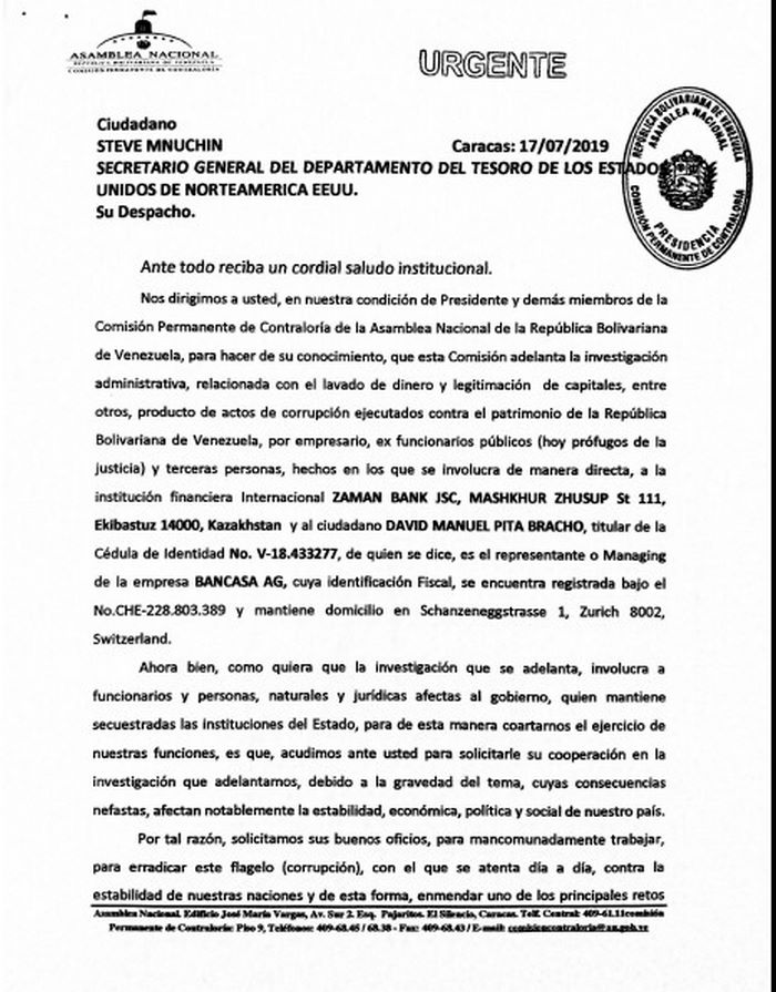El 17 de julio de 2019, los diputados Conrado Pérez, Richar Arteaga, Adolfo Superlano, Chain Bucarán y José Brito, presidente y miembros, respectivamente, de la Comisión Permanente de Contraloría de la Asamblea Nacional, emitieron una comunicación con carácter “urgente” dirigida al Fiscal General de los Estados Unidos, Jeff Sessions, para informarle que esa entidad del Poder Legislativo venezolano se encuentra realizando una investigación administrativa relacionada con el lavado de dinero y legitimación de capitales resultantes de los hechos de corrupción cometidos por empresarios, exfuncionarios —en la actualidad prófugos de la justicia— y terceras personas, en contra del patrimonio público de Venezuela.