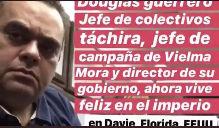 Venezolanos en los Estados Unidos se han manifestado indignados por la presencia de Douglas Guerrero en Davie, Florida. Según han asegurado en las redes Guerrero fue jefe de los “colectivos”, los grupos de choques de chavismo en Venezuela, así como jefe de campaña del ex-gobernador José Vielma Mora en la provincia de Táchira y director de su gobierno.