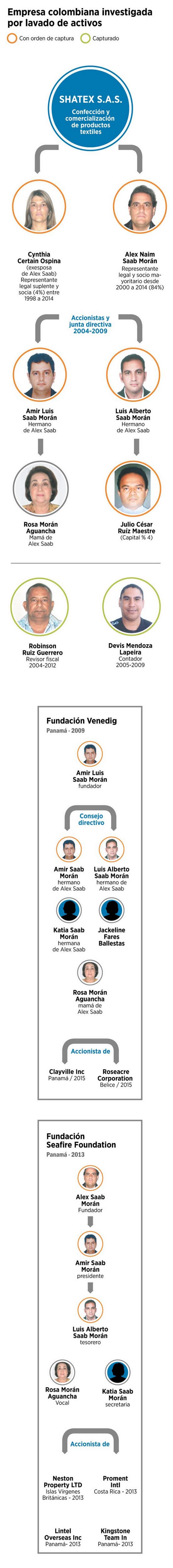 Según El Espectador de Colombia, en más de dos décadas, Alex Naín Saab Morán, el joven barranquillero que vendía uniformes corporativos en los años 80, logró transformar sus negocios locales en un emporio empresarial en el sector textil, la construcción y la alimentación. Su actividad comercial llegó a más de 10 países, principalmente Colombia, Panamá y Venezuela —donde es señalado de ser testaferro y contratista del chavismo— y hoy acumula una millonaria fortuna casi imposible de rastrear. Sin embargo, su éxito empresarial quedó en entredicho desde la captura del revisor fiscal y el contador de sus empresas, pues la Fiscalía de Colombia los señala de presuntamente participar en el entramado societario de Saab Morán para lavar dinero y enriquecerse ilícitamente.