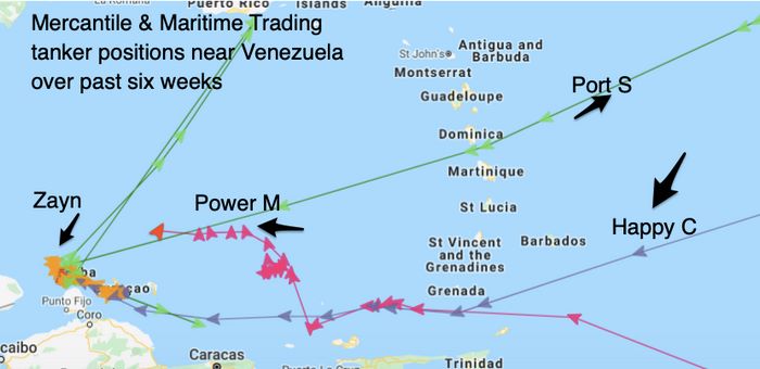 Otros buques de comercio mercantil y marítimo que ahora se encuentran frente a las costas de Venezuela incluyen el aframax con bandera de Panamá Happy C , el buque tanque de productos de 38,877 dwt con puerto de Malta, el puerto S , el VLCC Power M con bandera de Liberia y el tanquero de 7000 dwt Zayn .