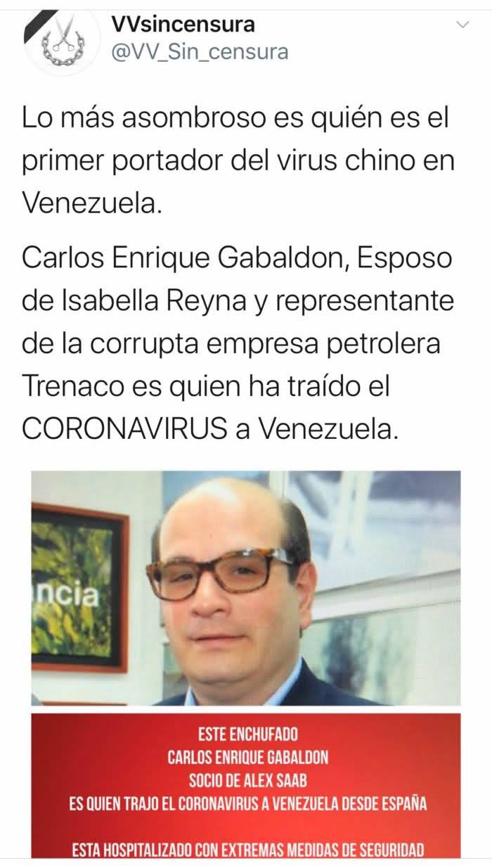 Carlos Enrique Gabaldón, esposo de Isabella Reyna y quien fuera representante de la empresa petrolera colombiana Trenaco, fue uno de los primeros casos de coronavirus reportados en Venezuela.