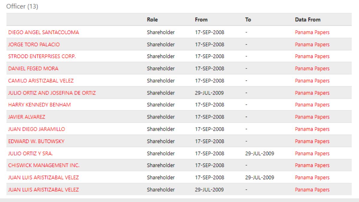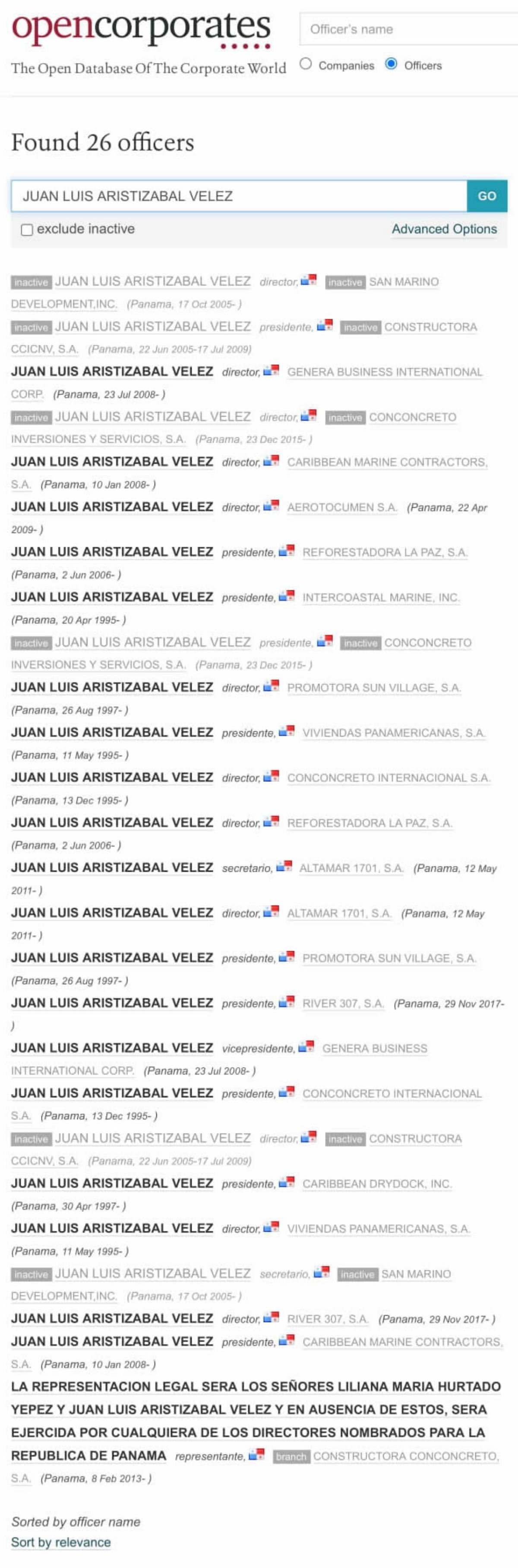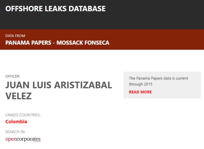 El nombre de Juan Luis Aristizábal Vélez figuró en la filtración Panama Papers, vinculado a la firma Justin Invest Limited en el paraíso fiscal de las Islas Vírgenes Británicas.