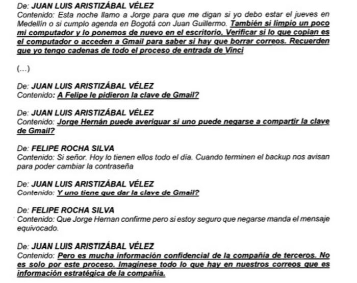 Otro parte del documento señala que Aristizábal Vélez y Tobón Nova, coordinaron por whatsapp el 22 de septiembre de 2016 la forma cómo evitarían entregar a las autoridades el computador del presidente de Conconcreto en caso de que les fuera solicitado.
