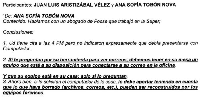 Por su parte, Ana Sofía Tobón Nova habría ejecutado la actuación tendiente a ocultar el equipo de cómputo corporativo de Aristizábal Vélez durante las actuaciones de la Superintendencia de Industria y Comercio, lo que configuró una obstrucción de la actuación administrativa.