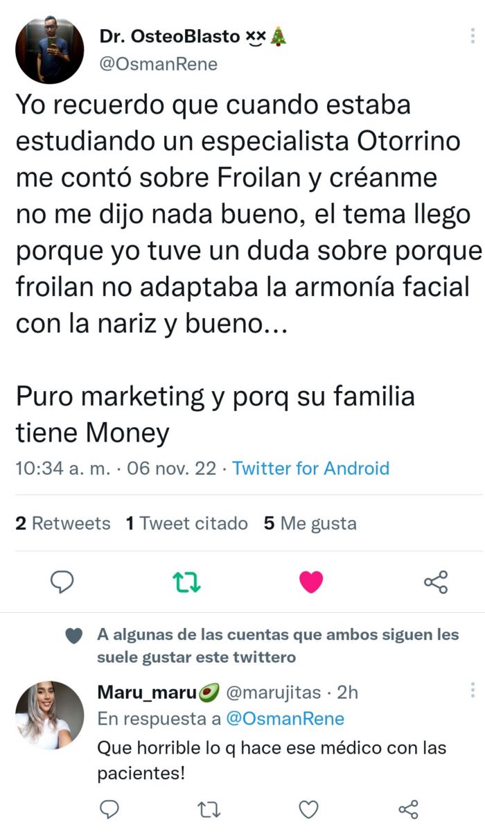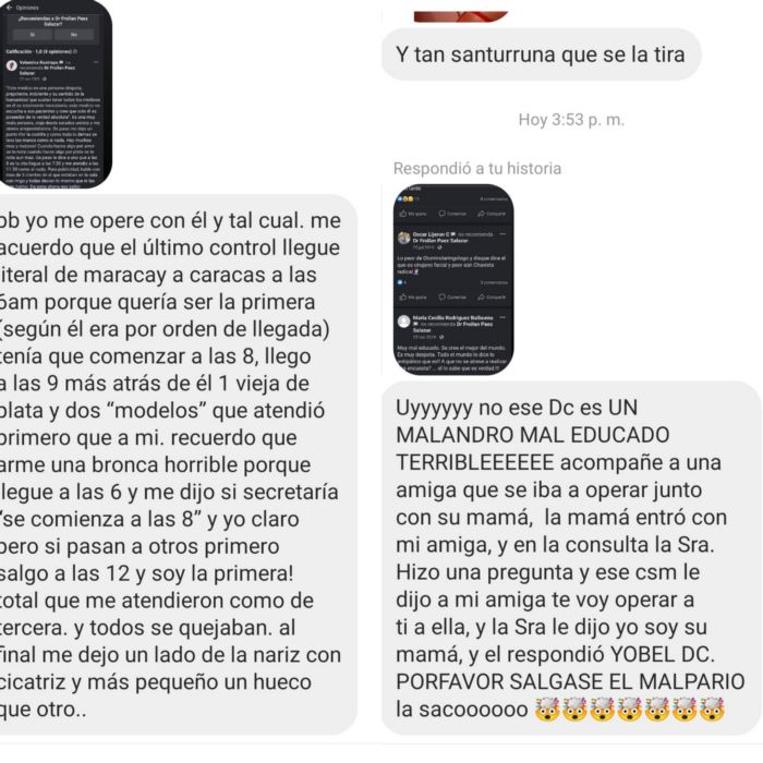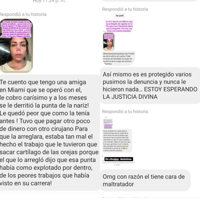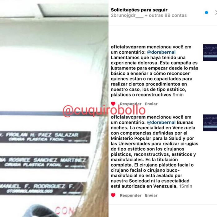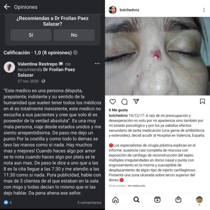 la información del caso se encontraba en la cuenta @botchedvnz de ig hackeada de ayer para hoy, pero guardé todo. El detalle más importante? Froilan se anuncia como cirujano plástico facial (la sociedad venezolana de estética dice que el título no existe en Vzla) y él es otorrino
